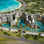 نسبة البناء “footprint” للمباني صغيرة — كثير من المساحة مخصصة للمناطق الخضراء، مياه، مناظر طبيعية وبحيرات/لابّاغون (بحيرات صناعية).