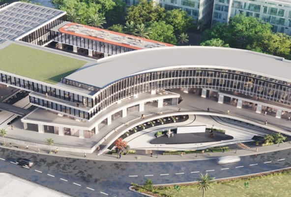 N90 يتميز بتصميم حديث — واجهات زجاجية كبيرة، أرضيات متدرجة، ومناطق خارجية (بلازا/لاندسكيب) حول المول