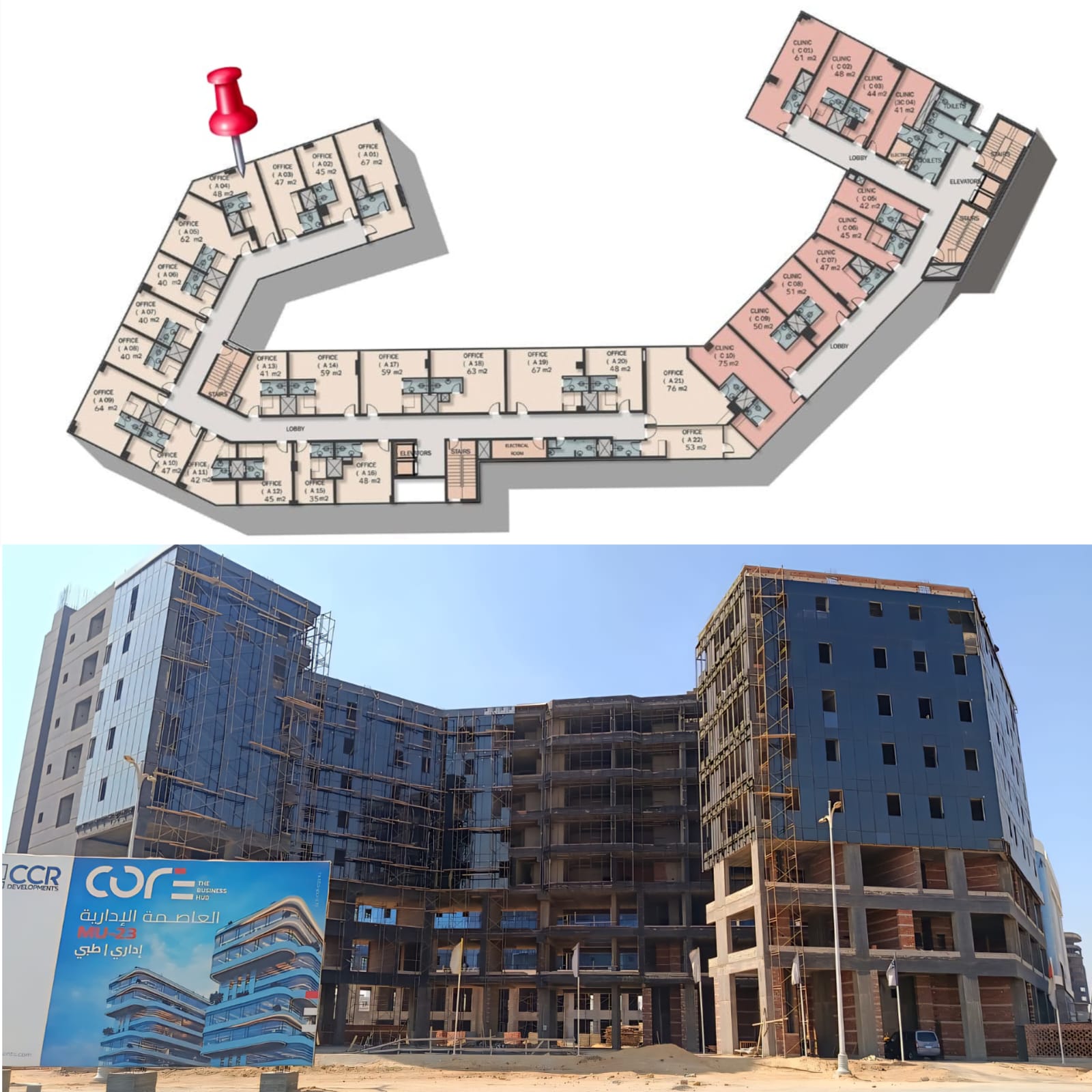 المكتب يقع في FRONT GAT – القطعة B1، MU23، العاصمة الإدارية الجديدة، مباشرة على محور الأمل، بالقرب من المدينة الرياضية، القرية الأولمبية، الحي الحكومي، والبرج الأيقوني. موقع ممتاز للأعمال مع حركة عالية للعملاء والزوار.