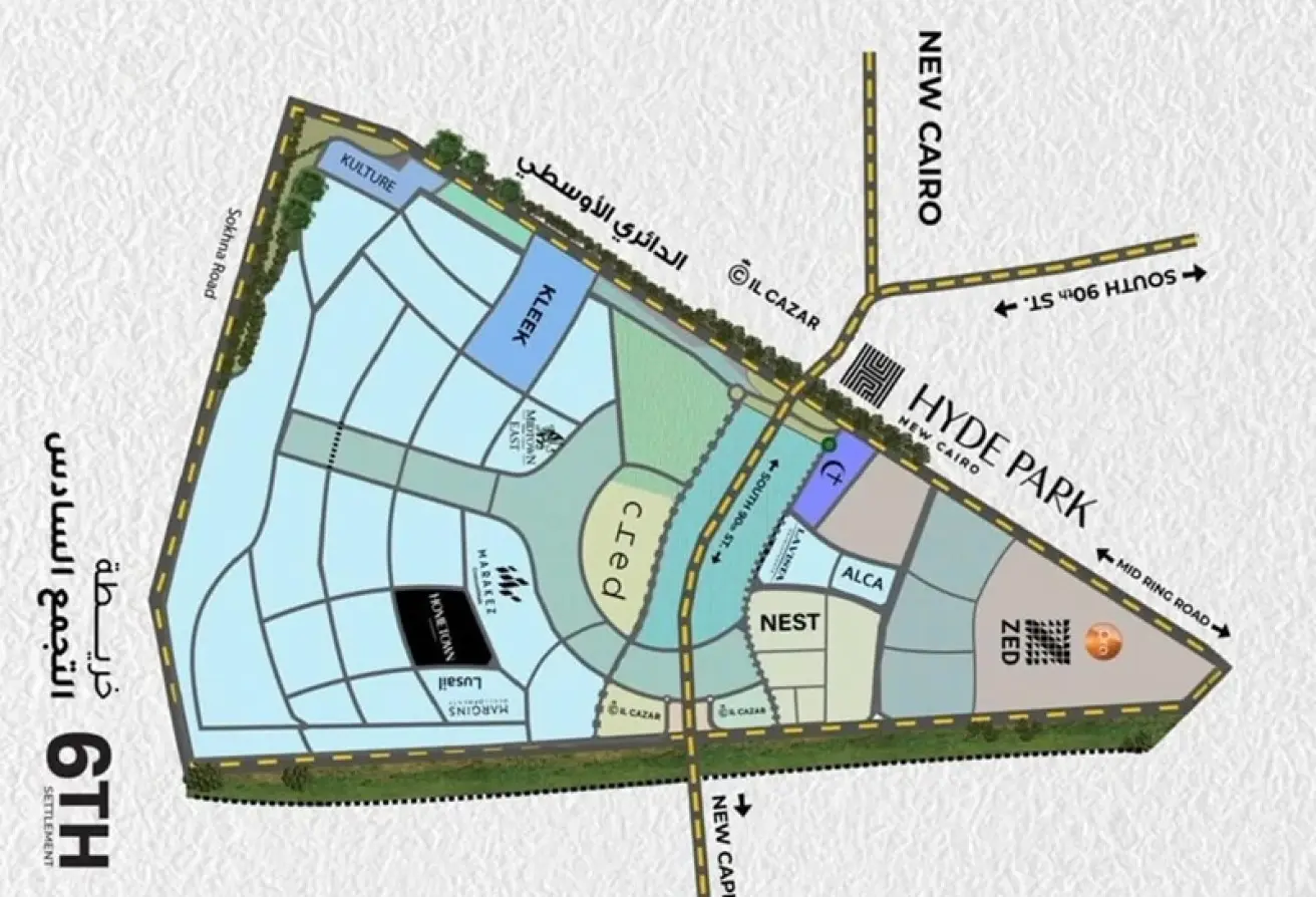 الموقع: التجمع السادس، القاهرة الجديدة، بالقرب من محور محمد نجيب ومحور جمال عبد الناصر، والطريق الدائري الأوسطي وطريق السويس، دقائق عن الجولدن سكوير وAUC، وقريب من مطار القاهرة الدولي والعاصمة الإدارية الجديدة.