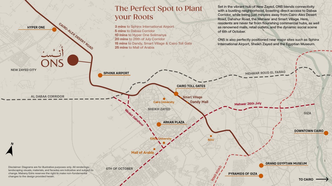 يقع Ons New Zayed أمام مطار سفنكس الدولي مباشرة وبالقرب من أهم المحاور: