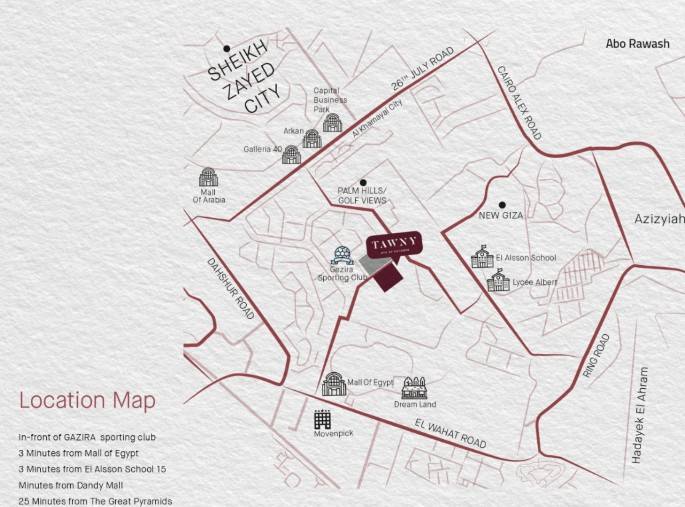 يقع كمبوند تاوني هايد بارك في موقع فريد أمام نادي الجزيرة الرياضي مباشرة،