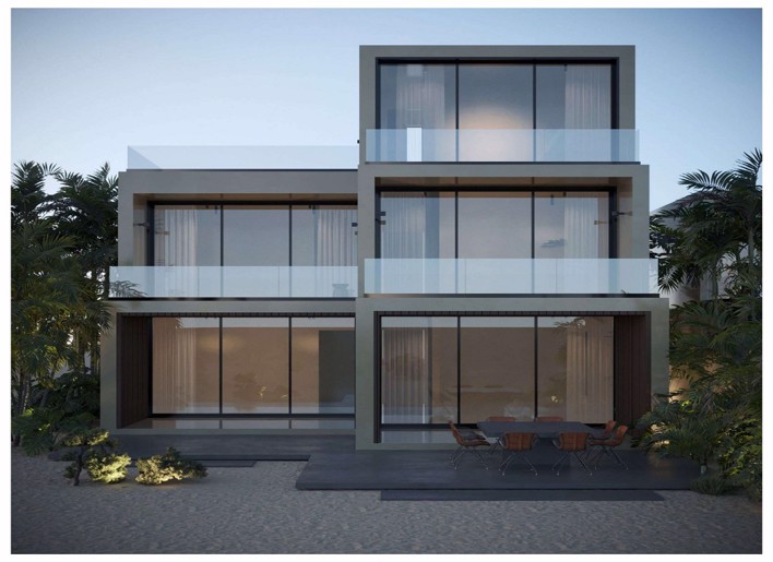 التصميم “مودرن / معاصر” مع واجهات زجاجية، نوافذ كبيرة، تراسات / بلكونات — بمعنى أن الفيو والاهتمام بالإطلالة مهم في التصميم.