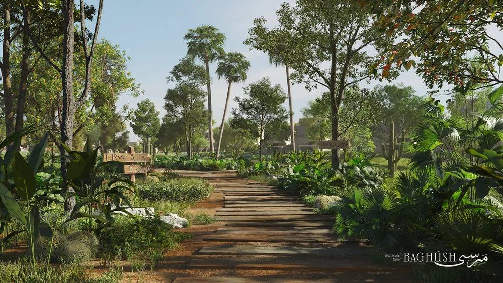 330 فدان رسمها المعماري شهاب مظهر كلوحةٍ مائية: 78 ٪ طبيعة وبحيرات، 22 ٪ فقط عمرانٌ منخفض الارتفاع كي لا يغلق الأفق.