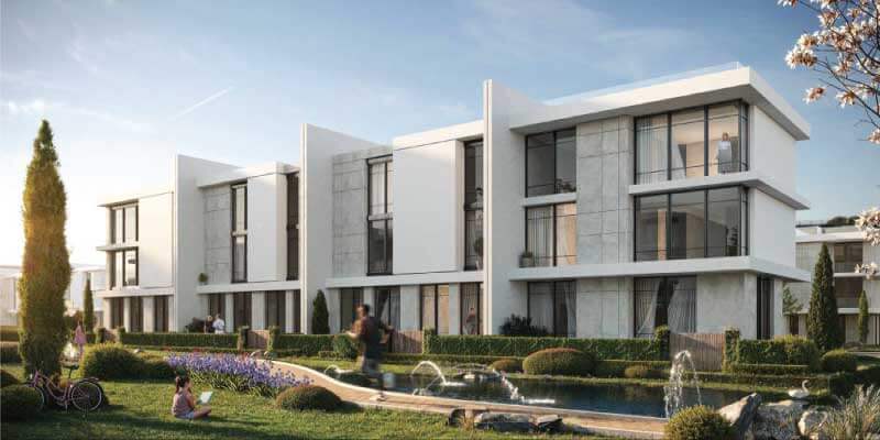 تخطيط Masterplan منخفض الكثافة مع مساحات خضراء وبحيرات ومسارات للمشي لإضفاء طابع هادئ ومريح للسكان.