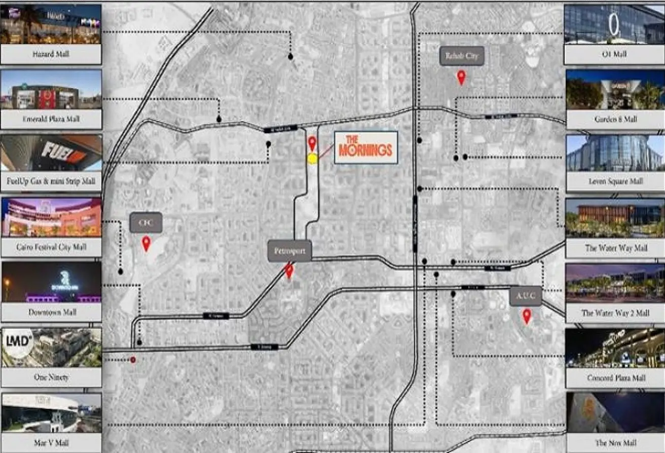 والجامعة الأمريكية بالقاهرة (AUC)، وعلى بُعد دقائق من كايرو فيستيفال سيتي.