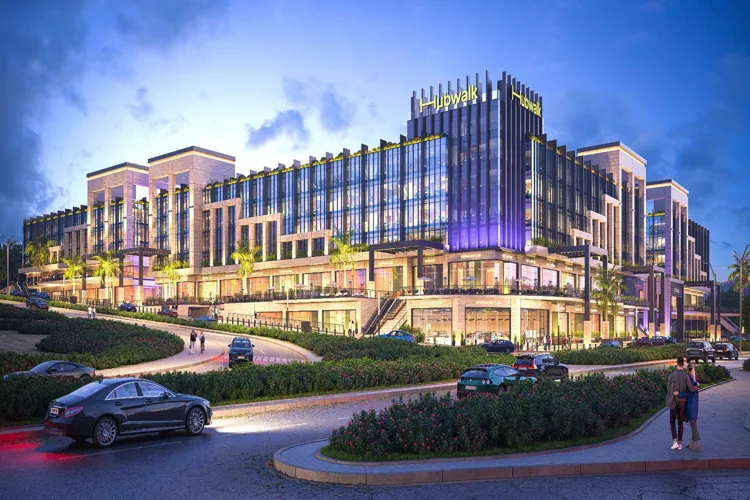 منطقة تجارية (Strip Mall) تشمل محلات، مطاعم، وكافيهات