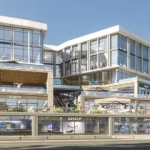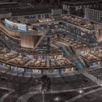 N90 يتميز بتصميم حديث — واجهات زجاجية كبيرة، أرضيات متدرجة، ومناطق خارجية (بلازا/لاندسكيب) حول المول