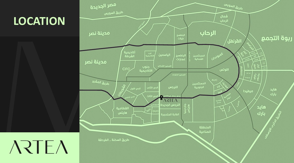 يقع ARTEA Mall (مول آرتيا) في قلب التجمع الخامس بالقاهرة الجديدة، عند تقاطع محور جمال عبد الناصر مع محور طلعت حرب.